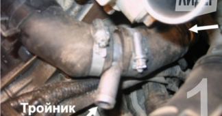 Снять угловой шланг, соединяющий магистраль помпы с головкой двигателя (рис. 1). Разрезать его посередине. Установить тройник в разрез шланга, предварительно надев хомуты. С каждой стороны шланга (на рис. 1 показано стрелками) отрезать по 10…12 мм. Установить шланг с тройником на место. Боковой отвод тройника направить в сторону подогревателя. Зафиксировать все соединения хомутами. |