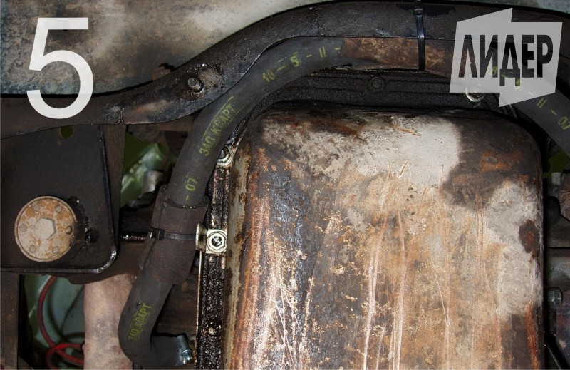 На выходной рукав надеть хомут, рукав надеть на штуцер, находящийся с левой стороны по ходу автомобиля и закрепить соединение хомутом (рис. 2). Входной рукав надеть на штуцер, находящийся с правой стороны по ходу автомобиля и закрепить соединение хомутом (рис. 5). На входной рукав надеть защитные шланги в соответствии с рис. 4, 5. Закрепить ремешком защитный шланг L3 = 100 мм с рукавом через отверстие диаметром 5,5-6,0 мм, которое необходимо предварительно просверлить посередине лонжерона на краю в отбортовке. Закрепить защитный шланг L4 = 50 мм с рукавом к скобке, при этом необходимо исключить касание входного рукава и картера двигателя. Заполнить систему охлаждения. |