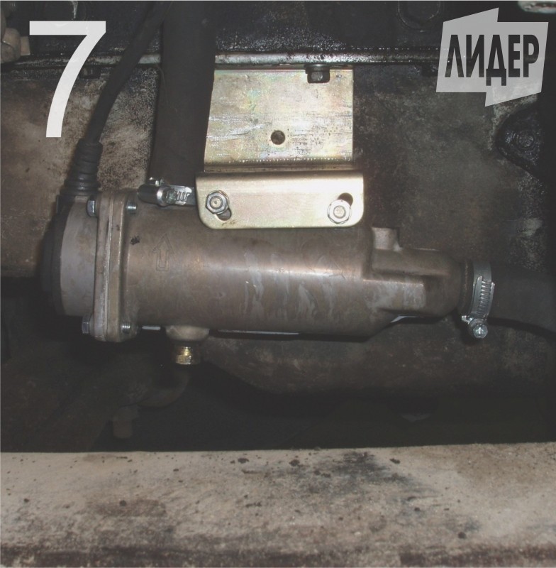 Закрепить подогреватель на кронштейне шпильками через втулки при помощи шайб и гаек, таким образом, чтобы передняя часть (входной патрубок) была опущена вниз под углом 5…10 градусов (рис. 2, 7). |