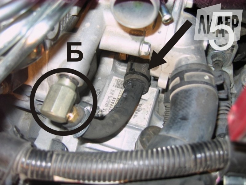 Выкрутить пробку (место указано на рис. 5, выноска Б) нанести герметик на наружную резьбу угольника и закрутить его вместо пробки. Боковое отверстие угольника направить вниз. Нанести герметик на резьбу штуцера и закрутить в боковое отверстие угольника (рис. 5, выноска Б). |